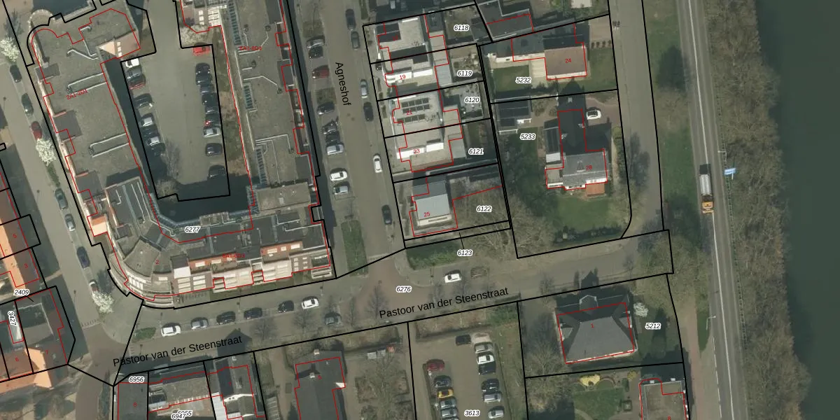 Agneshof 25 is gelegen op kadastraal perceel NDW00A6122. Deze kadastrale aanduiding is uniek en wordt gebruikt door het Kadaster om eigendomsrechten en andere zakelijke rechten vast te leggen. Het perceel maakt onderdeel uit van de kadastrale gemeente Nederweert.