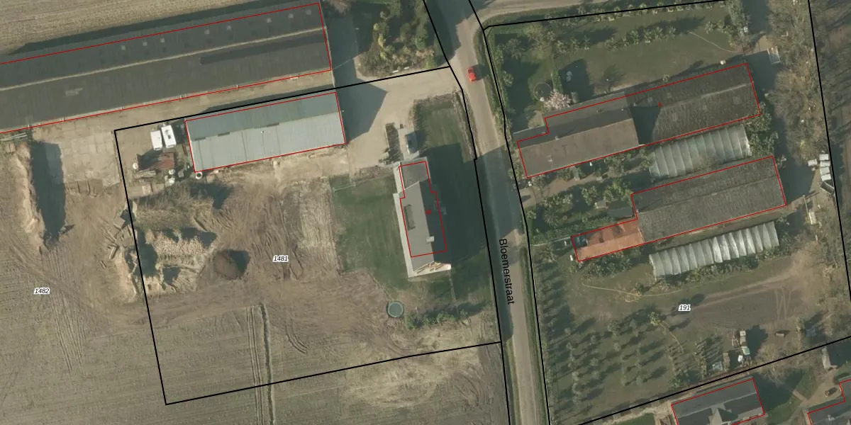 Het perceel waarop Bloemerstraat 1-B staat heeft een oppervlakte van 5330 m². Dit is een zeer groot perceel. De perceeloppervlakte wordt geregistreerd door het Kadaster. Gedetailleerde informatie over de maten van dit perceel kunt u vinden in het rapport Kadastrale kaart met maatvoering van Bloemerstraat 1-B.