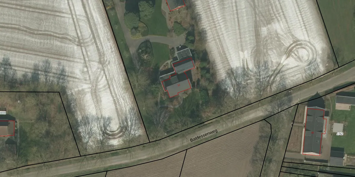 Het perceel waarop Baldessenweg 11 staat heeft een oppervlakte van 1,8 ha. Dit is een zeer groot perceel. De perceeloppervlakte wordt geregistreerd door het Kadaster. Gedetailleerde informatie over de maten van dit perceel kunt u vinden in het rapport Kadastrale kaart met maatvoering van Baldessenweg 11.