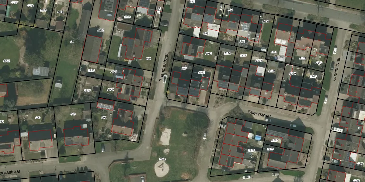 Speerstraat 1 is gelegen op kadastraal perceel NDW00R997. Deze kadastrale aanduiding is uniek en wordt gebruikt door het Kadaster om eigendomsrechten en andere zakelijke rechten vast te leggen. Het perceel maakt onderdeel uit van de kadastrale gemeente Nederweert.