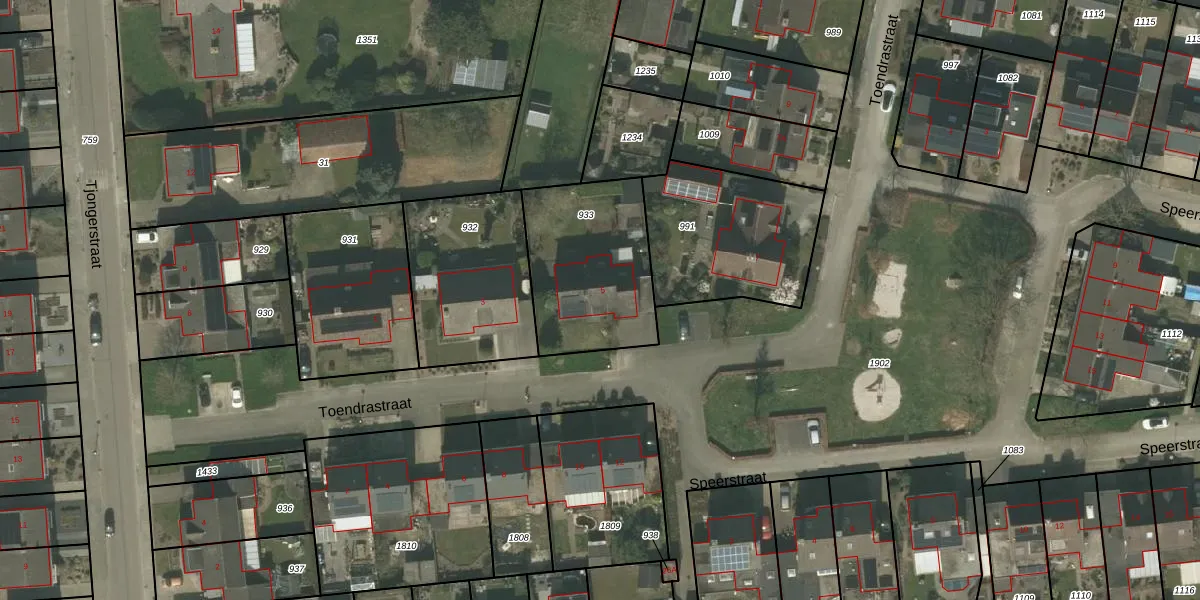 Toendrastraat 5 is gelegen op kadastraal perceel NDW00R933. Deze kadastrale aanduiding is uniek en wordt gebruikt door het Kadaster om eigendomsrechten en andere zakelijke rechten vast te leggen. Het perceel maakt onderdeel uit van de kadastrale gemeente Nederweert.