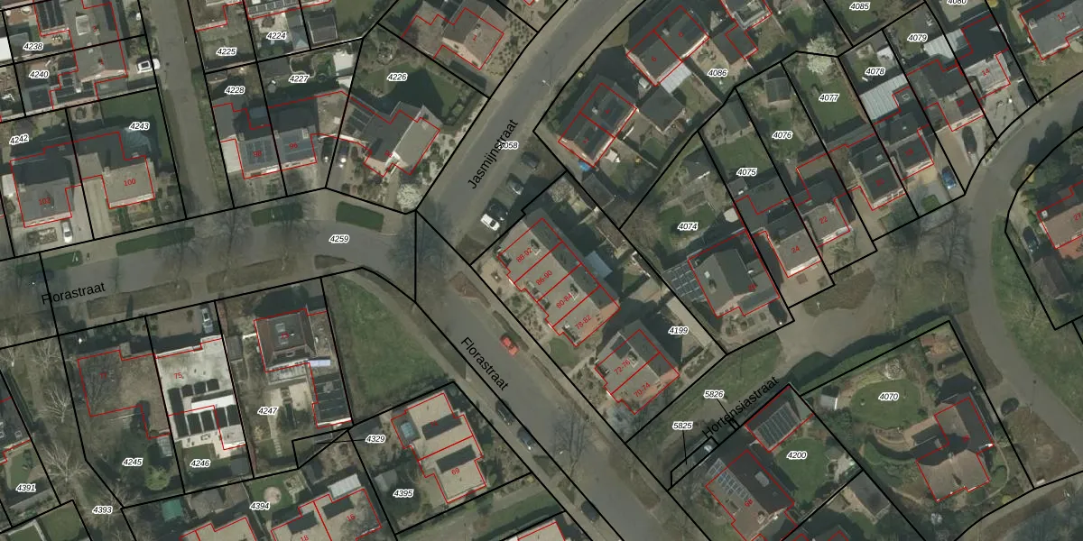 Florastraat 90 is gelegen op kadastraal perceel NDW00A4199. Deze kadastrale aanduiding is uniek en wordt gebruikt door het Kadaster om eigendomsrechten en andere zakelijke rechten vast te leggen. Het perceel maakt onderdeel uit van de kadastrale gemeente Nederweert.