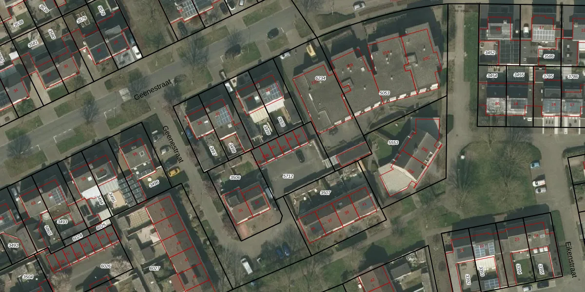 Geenestraat 33-E is gelegen op kadastraal perceel NDW00A5712. Deze kadastrale aanduiding is uniek en wordt gebruikt door het Kadaster om eigendomsrechten en andere zakelijke rechten vast te leggen. Het perceel maakt onderdeel uit van de kadastrale gemeente Nederweert.