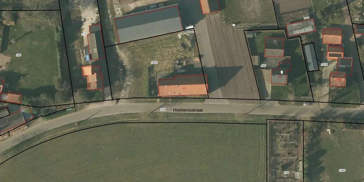Hoebensstraat 11 is gelegen op kadastraal perceel NDW00Y1402. Deze kadastrale aanduiding is uniek en wordt gebruikt door het Kadaster om eigendomsrechten en andere zakelijke rechten vast te leggen. Het perceel maakt onderdeel uit van de kadastrale gemeente Nederweert.