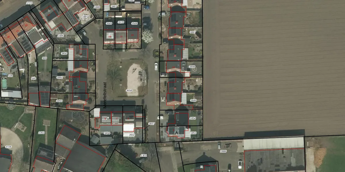Merefeltstraat 12 is gelegen op kadastraal perceel NDW00L3449. Deze kadastrale aanduiding is uniek en wordt gebruikt door het Kadaster om eigendomsrechten en andere zakelijke rechten vast te leggen. Het perceel maakt onderdeel uit van de kadastrale gemeente Nederweert.
