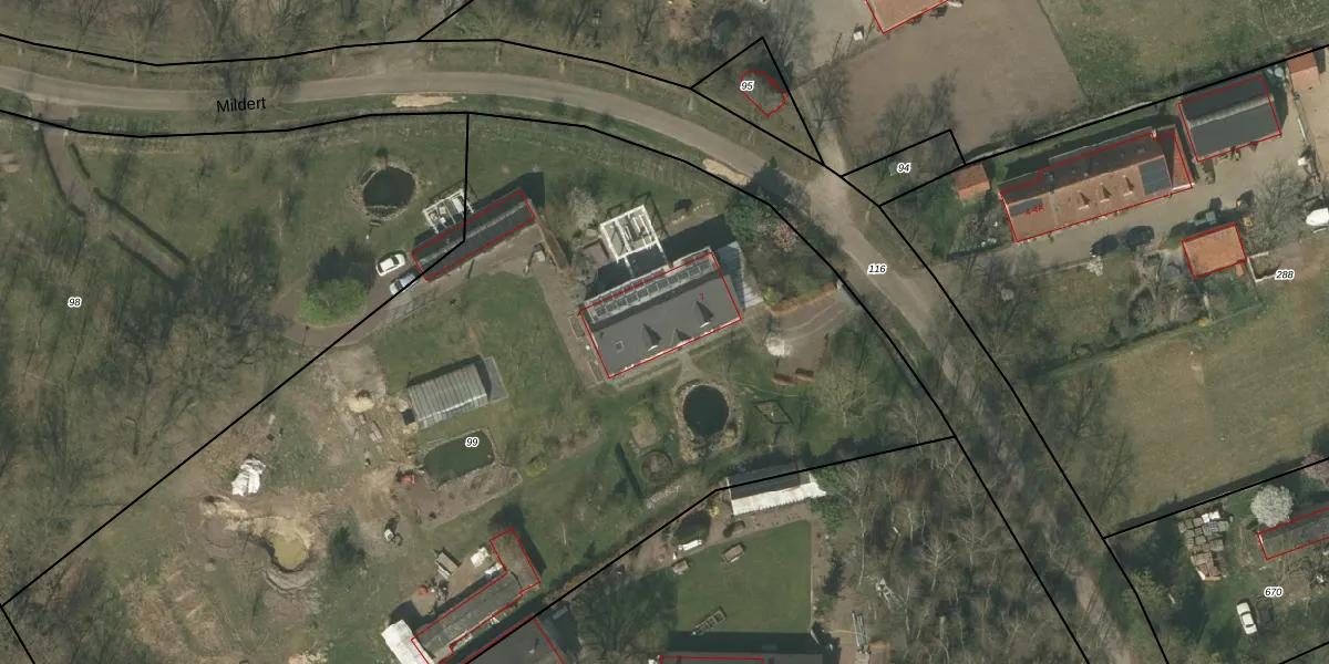 Het perceel waarop Mildert 7 staat heeft een oppervlakte van 6970 m². Dit is een zeer groot perceel. De perceeloppervlakte wordt geregistreerd door het Kadaster. Gedetailleerde informatie over de maten van dit perceel kunt u vinden in het rapport Kadastrale kaart met maatvoering van Mildert 7.