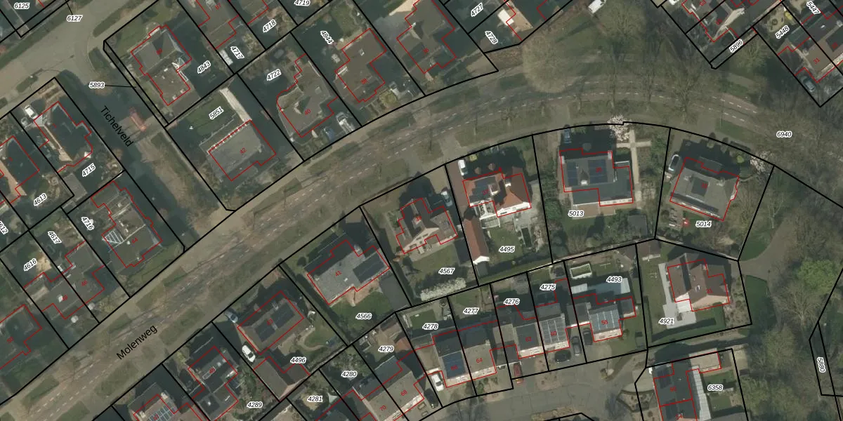 Het perceel waarop Molenweg 39 staat heeft een oppervlakte van 555 m². Dit is een groot perceel. De perceeloppervlakte wordt geregistreerd door het Kadaster. Gedetailleerde informatie over de maten van dit perceel kunt u vinden in het rapport Kadastrale kaart met maatvoering van Molenweg 39.