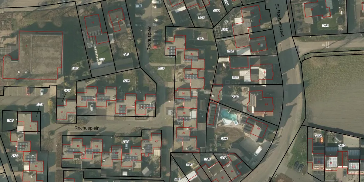 Het perceel waarop Rochusplein 30 staat heeft een oppervlakte van 1485 m². Dit is een zeer groot perceel. De perceeloppervlakte wordt geregistreerd door het Kadaster. Gedetailleerde informatie over de maten van dit perceel kunt u vinden in het rapport Kadastrale kaart met maatvoering van Rochusplein 30.