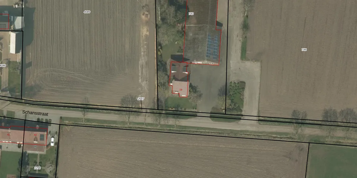 Schansstraat 19 is gelegen op kadastraal perceel NDW00L743. Deze kadastrale aanduiding is uniek en wordt gebruikt door het Kadaster om eigendomsrechten en andere zakelijke rechten vast te leggen. Het perceel maakt onderdeel uit van de kadastrale gemeente Nederweert.