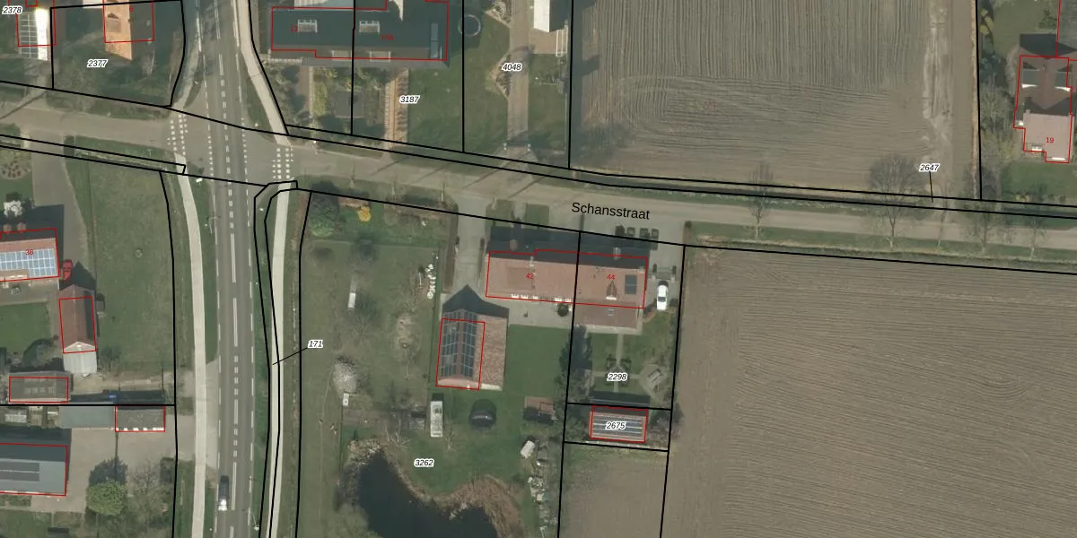 Het perceel waarop Schansstraat 42 staat heeft een oppervlakte van 3905 m². Dit is een zeer groot perceel. De perceeloppervlakte wordt geregistreerd door het Kadaster. Gedetailleerde informatie over de maten van dit perceel kunt u vinden in het rapport Kadastrale kaart met maatvoering van Schansstraat 42.