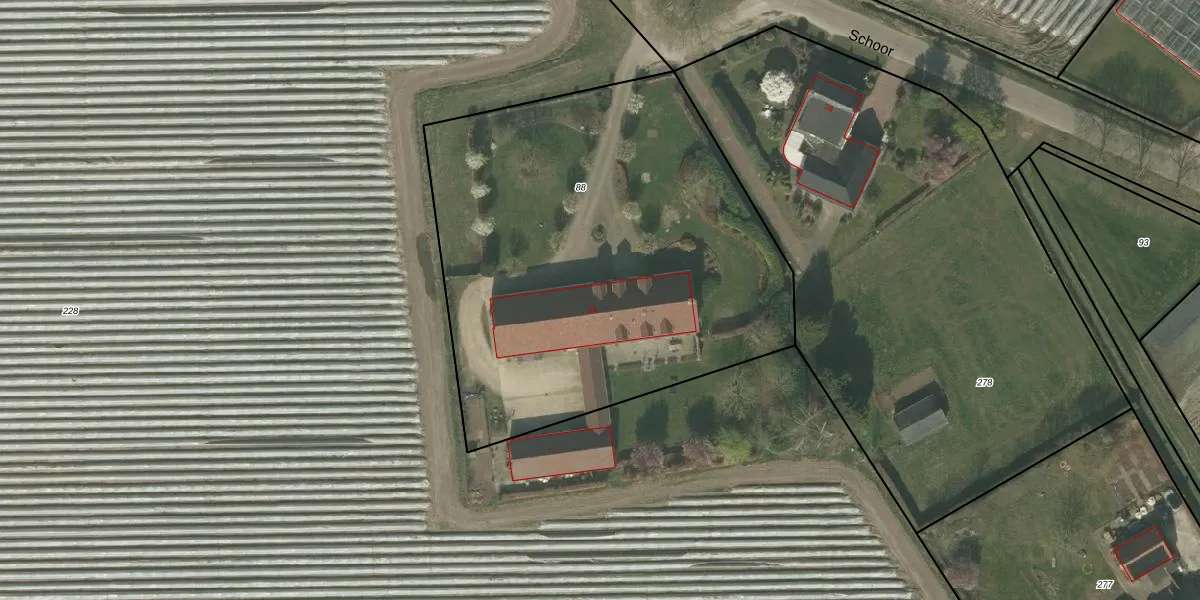 Het perceel waarop Schoor 24 staat heeft een oppervlakte van 2716 m². Dit is een zeer groot perceel. De perceeloppervlakte wordt geregistreerd door het Kadaster. Gedetailleerde informatie over de maten van dit perceel kunt u vinden in het rapport Kadastrale kaart met maatvoering van Schoor 24.