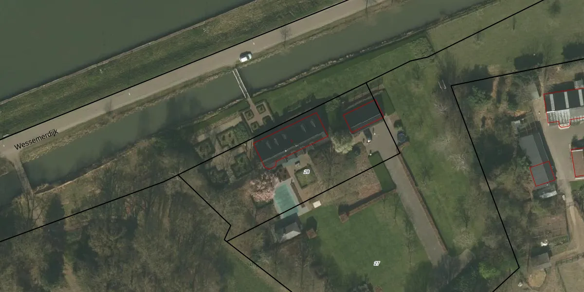 Het perceel waarop Wessemerdijk 2 staat heeft een oppervlakte van 1832 m². Dit is een zeer groot perceel. De perceeloppervlakte wordt geregistreerd door het Kadaster. Gedetailleerde informatie over de maten van dit perceel kunt u vinden in het rapport Kadastrale kaart met maatvoering van Wessemerdijk 2.