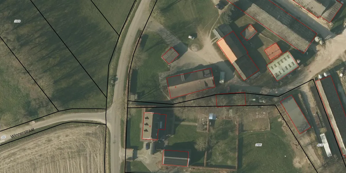 Het perceel waarop Winnerstraat 8 staat heeft een oppervlakte van 2,0 ha. Dit is een zeer groot perceel. De perceeloppervlakte wordt geregistreerd door het Kadaster. Gedetailleerde informatie over de maten van dit perceel kunt u vinden in het rapport Kadastrale kaart met maatvoering van Winnerstraat 8.