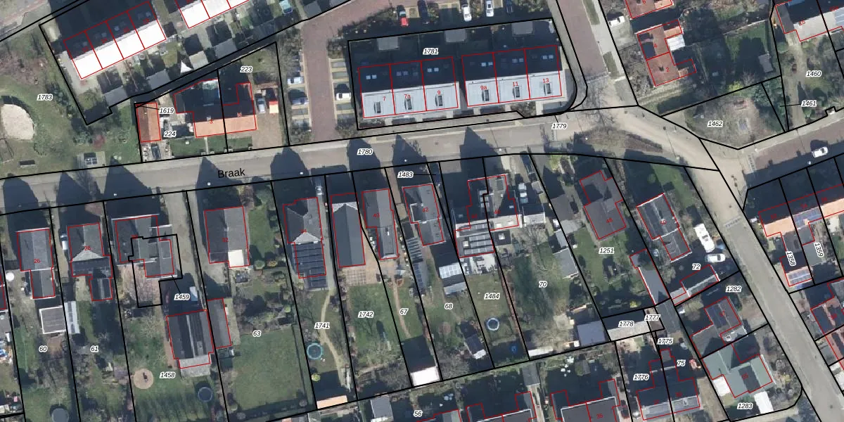 Het perceel waarop Braak 42 staat heeft een oppervlakte van 585 m². Dit is een groot perceel. De perceeloppervlakte wordt geregistreerd door het Kadaster. Gedetailleerde informatie over de maten van dit perceel kunt u vinden in het rapport Kadastrale kaart met maatvoering van Braak 42.