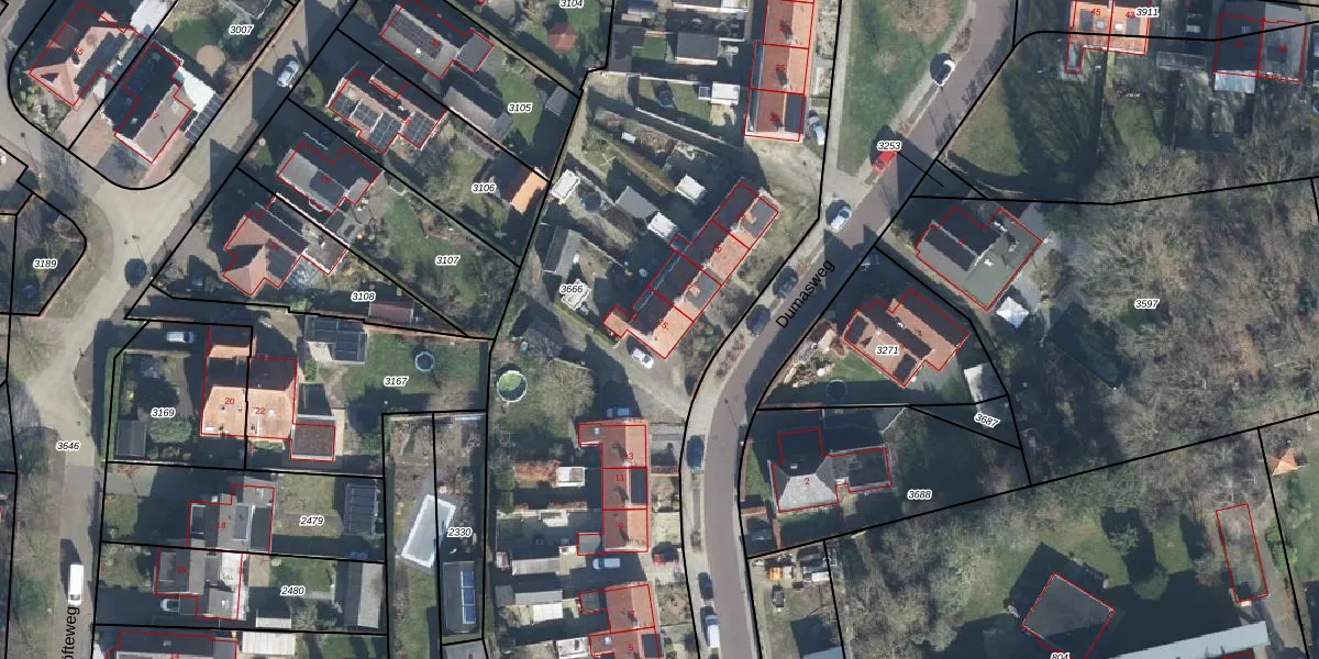 Dumasweg 15 is gelegen op kadastraal perceel NDE00G3666. Deze kadastrale aanduiding is uniek en wordt gebruikt door het Kadaster om eigendomsrechten en andere zakelijke rechten vast te leggen. Het perceel maakt onderdeel uit van de kadastrale gemeente Neede.