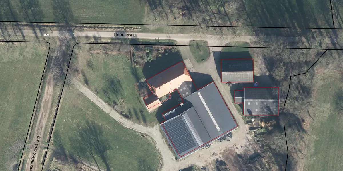 Het perceel waarop Hoonteweg 3 staat heeft een oppervlakte van 4,0 ha. Dit is een zeer groot perceel. De perceeloppervlakte wordt geregistreerd door het Kadaster. Gedetailleerde informatie over de maten van dit perceel kunt u vinden in het rapport Kadastrale kaart met maatvoering van Hoonteweg 3.