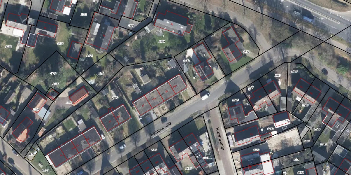 Het perceel waarop Kempersdijk 49-a staat heeft een oppervlakte van 2754 m². Dit is een zeer groot perceel. De perceeloppervlakte wordt geregistreerd door het Kadaster. Gedetailleerde informatie over de maten van dit perceel kunt u vinden in het rapport Kadastrale kaart met maatvoering van Kempersdijk 49-a.