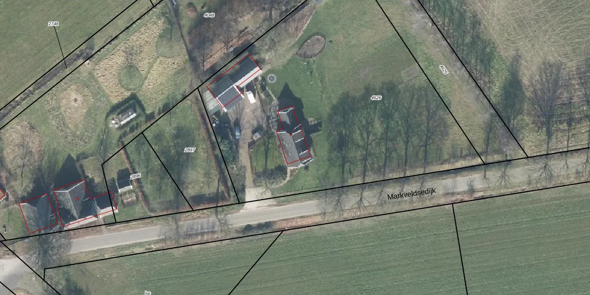 Het perceel waarop Markveldsedijk 8 staat heeft een oppervlakte van 4355 m². Dit is een zeer groot perceel. De perceeloppervlakte wordt geregistreerd door het Kadaster. Gedetailleerde informatie over de maten van dit perceel kunt u vinden in het rapport Kadastrale kaart met maatvoering van Markveldsedijk 8.