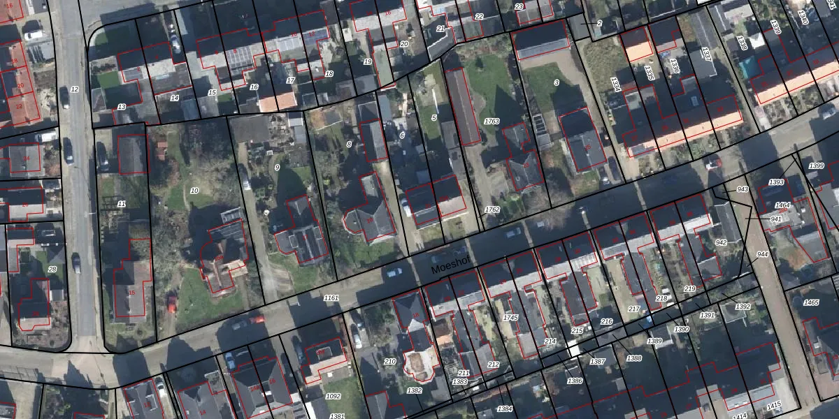Het perceel waarop Moeshof 21 staat heeft een oppervlakte van 357 m². Dit is een groot perceel. De perceeloppervlakte wordt geregistreerd door het Kadaster. Gedetailleerde informatie over de maten van dit perceel kunt u vinden in het rapport Kadastrale kaart met maatvoering van Moeshof 21.