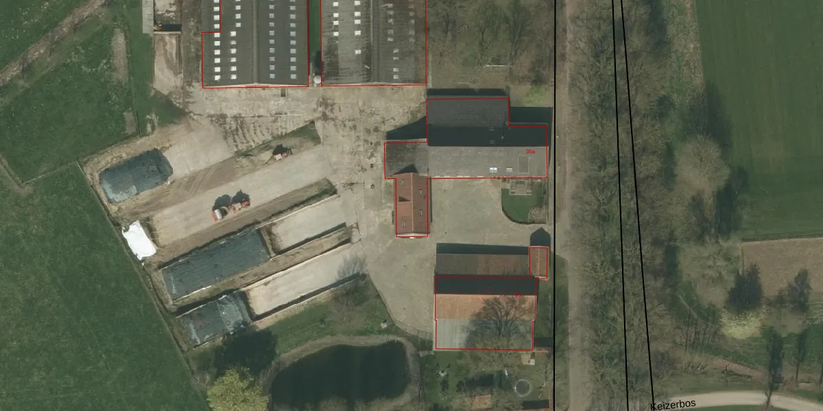 Het perceel waarop Dries 35-a staat heeft een oppervlakte van 12,5 ha. Dit is een zeer groot perceel. De perceeloppervlakte wordt geregistreerd door het Kadaster. Gedetailleerde informatie over de maten van dit perceel kunt u vinden in het rapport Kadastrale kaart met maatvoering van Dries 35-a.