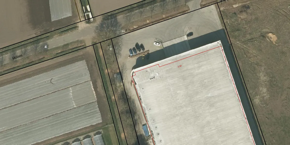 Het perceel waarop Hoven 3 staat heeft een oppervlakte van 1,5 ha. Dit is een zeer groot perceel. De perceeloppervlakte wordt geregistreerd door het Kadaster. Gedetailleerde informatie over de maten van dit perceel kunt u vinden in het rapport Kadastrale kaart met maatvoering van Hoven 3.