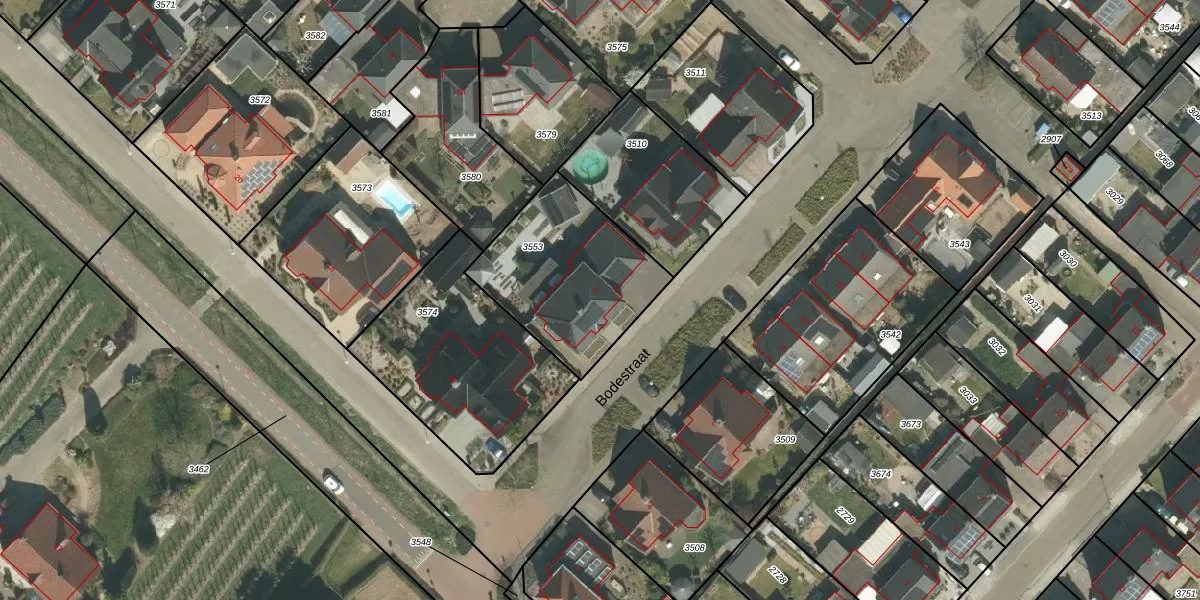 Het perceel waarop Bodestraat 3 staat heeft een oppervlakte van 608 m². Dit is een groot perceel. De perceeloppervlakte wordt geregistreerd door het Kadaster. Gedetailleerde informatie over de maten van dit perceel kunt u vinden in het rapport Kadastrale kaart met maatvoering van Bodestraat 3.