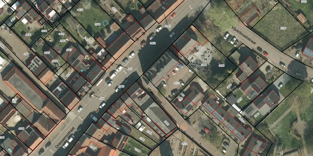 Het perceel waarop Molenstraat 25 staat heeft een oppervlakte van 595 m². Dit is een groot perceel. De perceeloppervlakte wordt geregistreerd door het Kadaster. Gedetailleerde informatie over de maten van dit perceel kunt u vinden in het rapport Kadastrale kaart met maatvoering van Molenstraat 25.