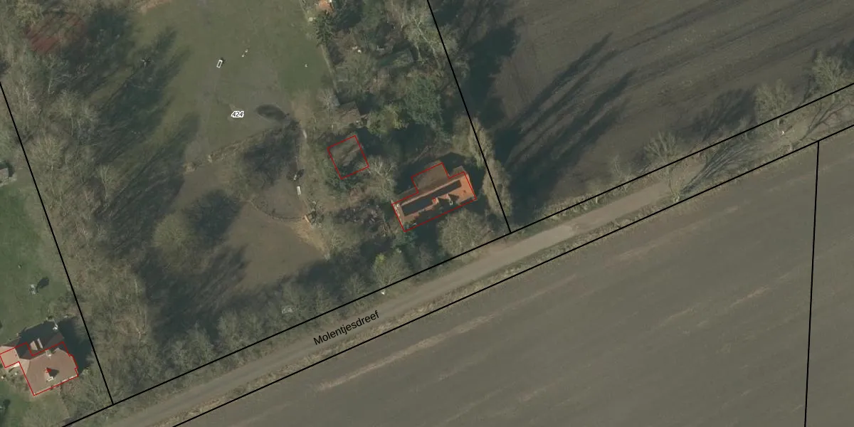 Het perceel waarop Molentjesdreef 5 staat heeft een oppervlakte van 9990 m². Dit is een zeer groot perceel. De perceeloppervlakte wordt geregistreerd door het Kadaster. Gedetailleerde informatie over de maten van dit perceel kunt u vinden in het rapport Kadastrale kaart met maatvoering van Molentjesdreef 5.