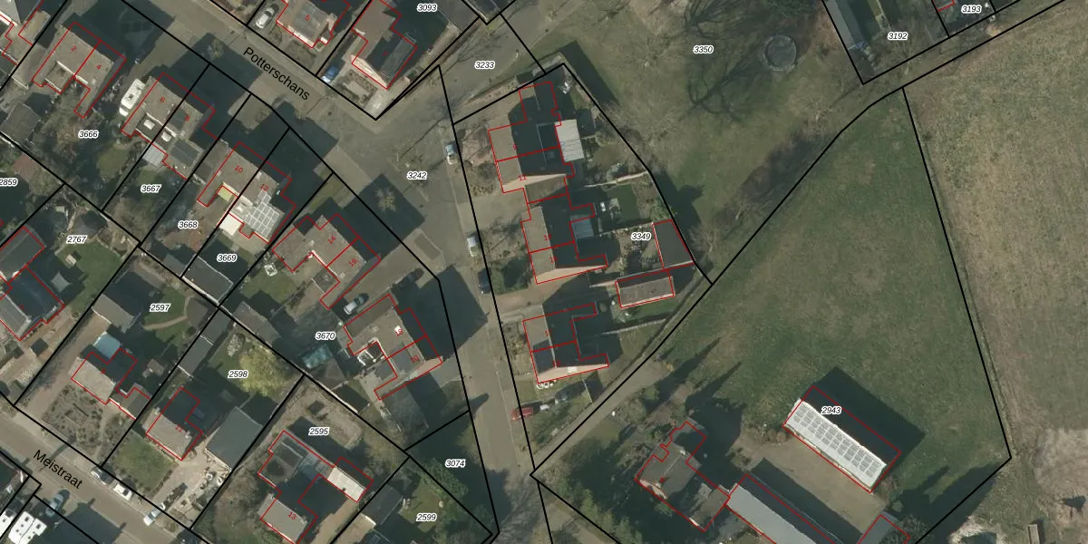 Het perceel waarop Potterschans 15 staat heeft een oppervlakte van 1912 m². Dit is een zeer groot perceel. De perceeloppervlakte wordt geregistreerd door het Kadaster. Gedetailleerde informatie over de maten van dit perceel kunt u vinden in het rapport Kadastrale kaart met maatvoering van Potterschans 15.