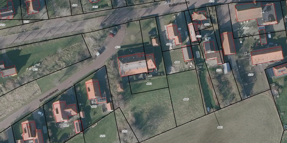 Het perceel waarop het adres ligt is NES01-A-4670. De afkorting 'NES01' staat voor kadastrale gemeente Nes Ameland. Het perceel is 4360 m² groot. Dat is kleiner dan de gemiddelde perceeloppervlakte in Nes Ameland, dat op 7,0 ha ligt. Het grootste perceel in de kadastrale gemeente is 58,73 km². Het kleinste perceel heeft een oppervlakte van 1 m². Er zijn 8 adressen aanwezig op het perceel. De huidige grenzen van het perceel zijn digitaal in de Basisregistratie Kadaster (BRK) geregistreerd op 15-11-2007.