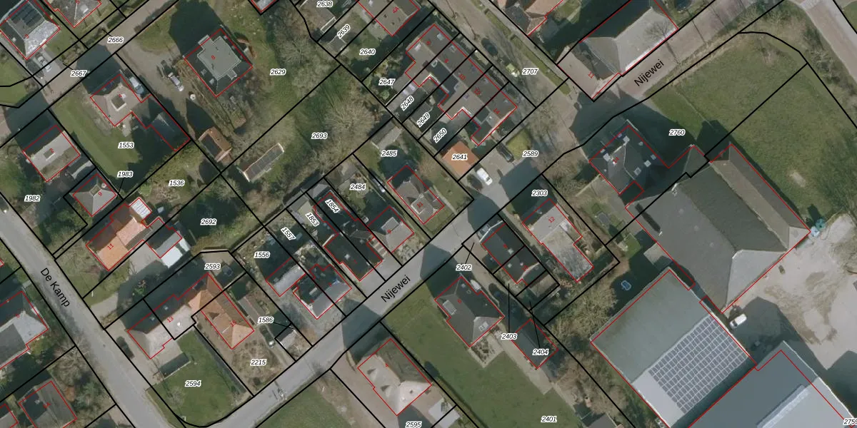 Het perceel waarop Nijewei 11 staat heeft een oppervlakte van 360 m². Dit is een groot perceel. De perceeloppervlakte wordt geregistreerd door het Kadaster. Gedetailleerde informatie over de maten van dit perceel kunt u vinden in het rapport Kadastrale kaart met maatvoering van Nijewei 11.