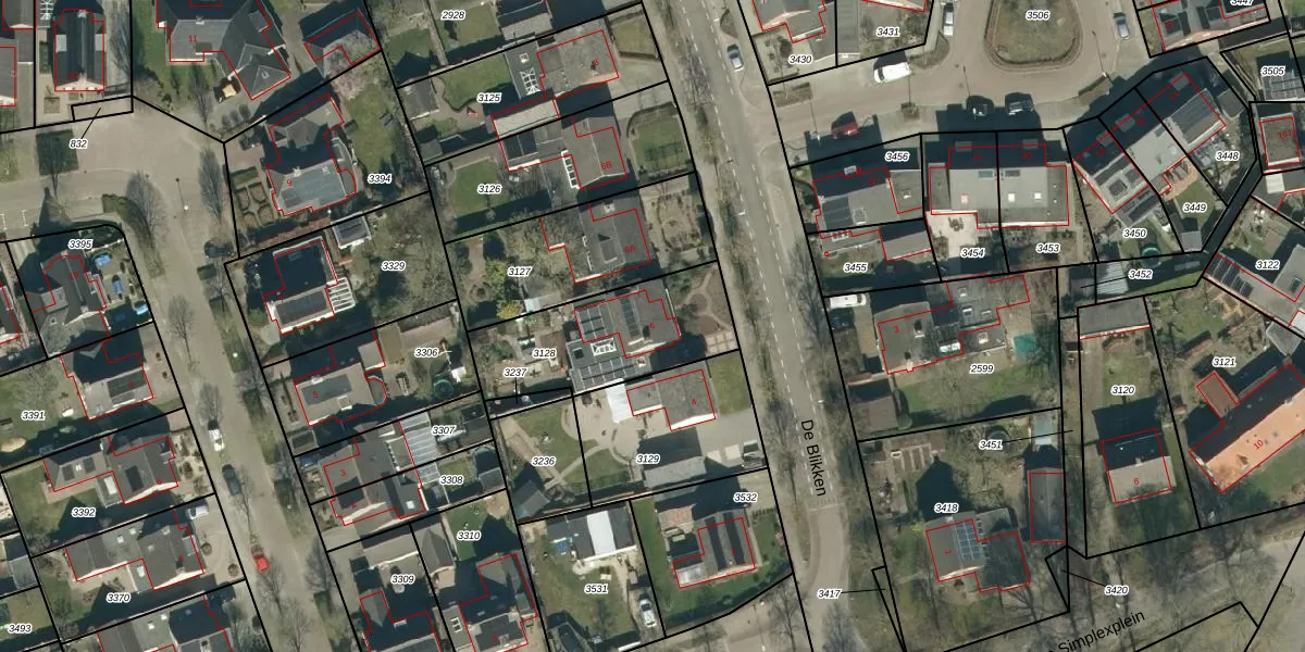 Het perceel waarop De Blikken 6 staat heeft een oppervlakte van 530 m². Dit is een groot perceel. De perceeloppervlakte wordt geregistreerd door het Kadaster. Gedetailleerde informatie over de maten van dit perceel kunt u vinden in het rapport Kadastrale kaart met maatvoering van De Blikken 6.