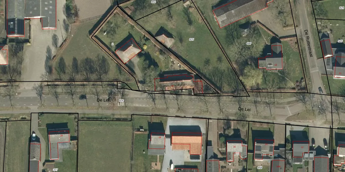 Het perceel waarop De Lei 15 staat heeft een oppervlakte van 1525 m². Dit is een zeer groot perceel. De perceeloppervlakte wordt geregistreerd door het Kadaster. Gedetailleerde informatie over de maten van dit perceel kunt u vinden in het rapport Kadastrale kaart met maatvoering van De Lei 15.