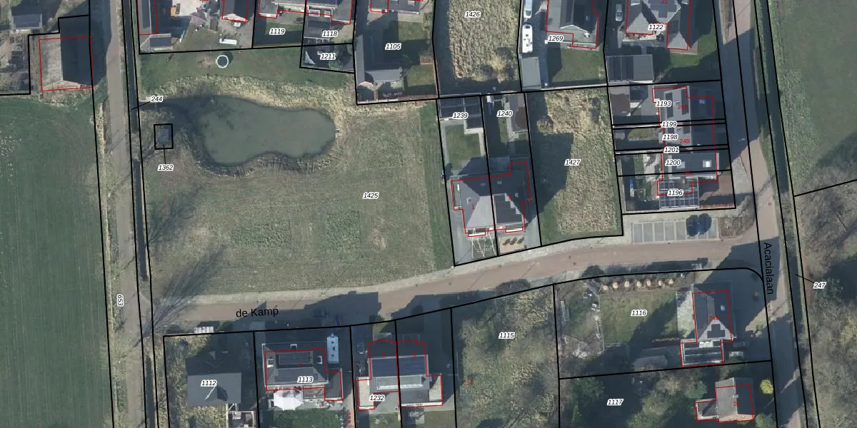 Het perceel waarop de Kamp 1-H staat heeft een oppervlakte van 5926 m². Dit is een zeer groot perceel. De perceeloppervlakte wordt geregistreerd door het Kadaster. Gedetailleerde informatie over de maten van dit perceel kunt u vinden in het rapport Kadastrale kaart met maatvoering van de Kamp 1-H.