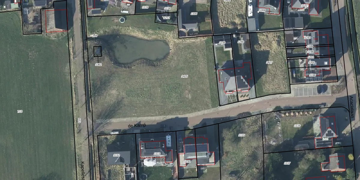 Het perceel waarop de Kamp 1-F staat heeft een oppervlakte van 5926 m². Dit is een zeer groot perceel. De perceeloppervlakte wordt geregistreerd door het Kadaster. Gedetailleerde informatie over de maten van dit perceel kunt u vinden in het rapport Kadastrale kaart met maatvoering van de Kamp 1-F.