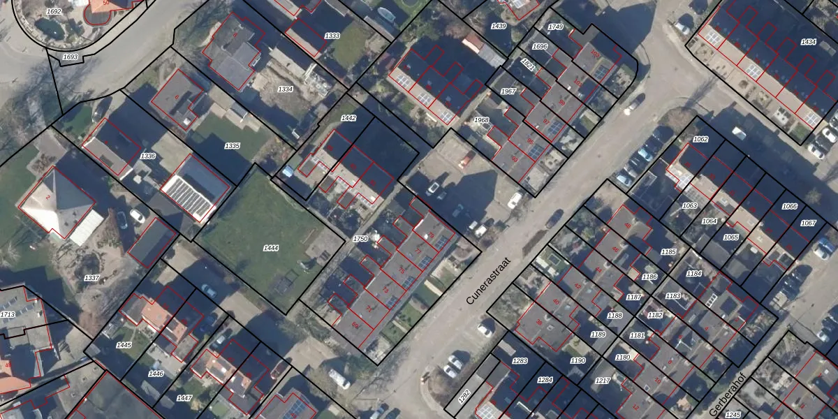 Het perceel waarop Cunerastraat 79 staat heeft een oppervlakte van 1354 m². Dit is een zeer groot perceel. De perceeloppervlakte wordt geregistreerd door het Kadaster. Gedetailleerde informatie over de maten van dit perceel kunt u vinden in het rapport Kadastrale kaart met maatvoering van Cunerastraat 79.