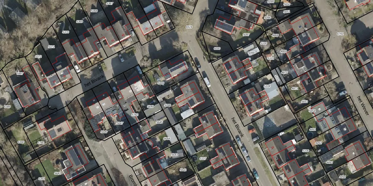 Het perceel waarop het Bivank 15 staat heeft een oppervlakte van 508 m². Dit is een groot perceel. De perceeloppervlakte wordt geregistreerd door het Kadaster. Gedetailleerde informatie over de maten van dit perceel kunt u vinden in het rapport Kadastrale kaart met maatvoering van het Bivank 15.