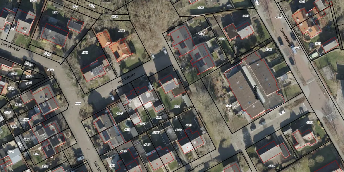 Het perceel waarop het Wever 10 staat heeft een oppervlakte van 438 m². Dit is een groot perceel. De perceeloppervlakte wordt geregistreerd door het Kadaster. Gedetailleerde informatie over de maten van dit perceel kunt u vinden in het rapport Kadastrale kaart met maatvoering van het Wever 10.