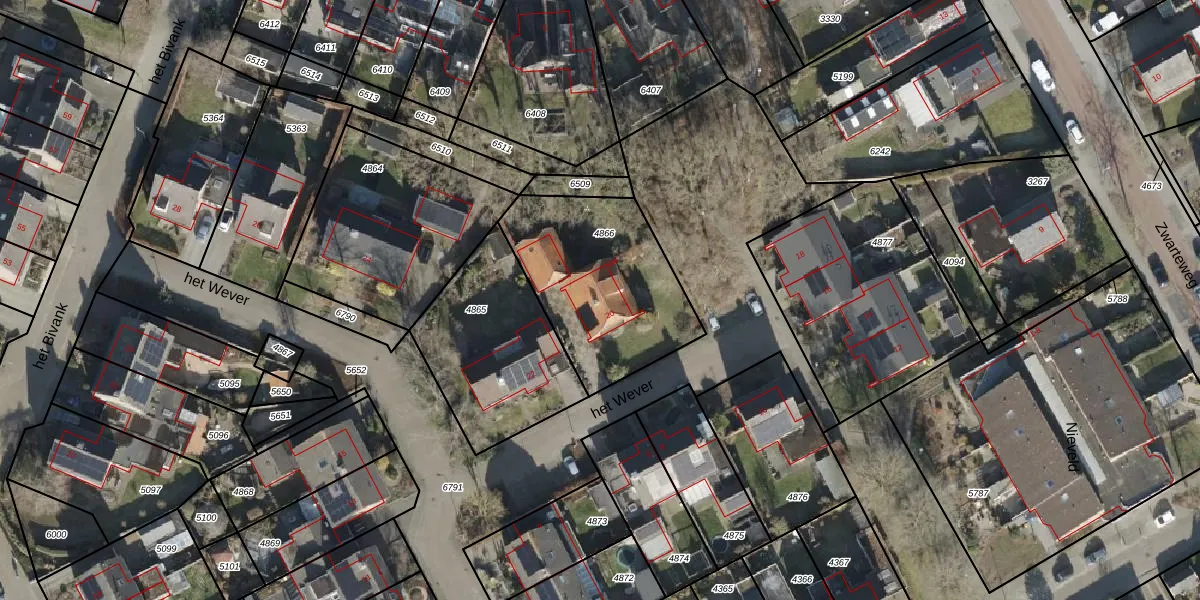 Het perceel waarop het Wever 20 staat heeft een oppervlakte van 686 m². Dit is een groot perceel. De perceeloppervlakte wordt geregistreerd door het Kadaster. Gedetailleerde informatie over de maten van dit perceel kunt u vinden in het rapport Kadastrale kaart met maatvoering van het Wever 20.