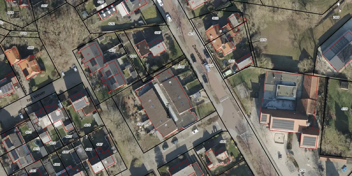 Het perceel waarop Nieveld 8 staat heeft een oppervlakte van 1694 m². Dit is een zeer groot perceel. De perceeloppervlakte wordt geregistreerd door het Kadaster. Gedetailleerde informatie over de maten van dit perceel kunt u vinden in het rapport Kadastrale kaart met maatvoering van Nieveld 8.