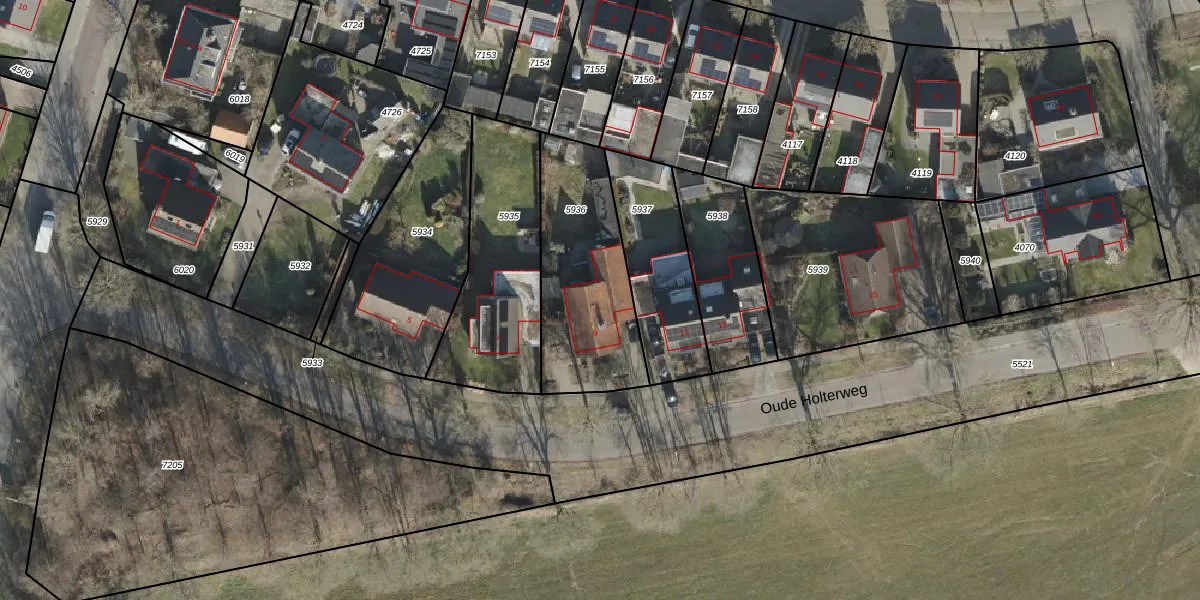 Het perceel waarop Oude Holterweg 9 staat heeft een oppervlakte van 604 m². Dit is een groot perceel. De perceeloppervlakte wordt geregistreerd door het Kadaster. Gedetailleerde informatie over de maten van dit perceel kunt u vinden in het rapport Kadastrale kaart met maatvoering van Oude Holterweg 9.