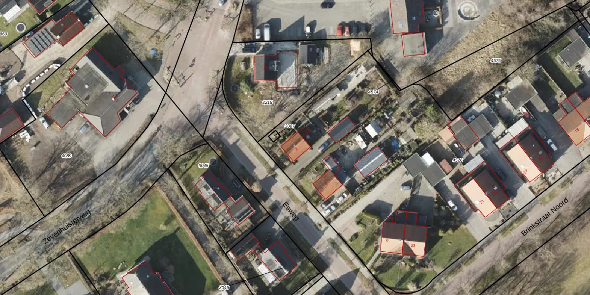 Het perceel waarop Esweg 2 staat heeft een oppervlakte van 5929 m². Dit is een zeer groot perceel. De perceeloppervlakte wordt geregistreerd door het Kadaster. Gedetailleerde informatie over de maten van dit perceel kunt u vinden in het rapport Kadastrale kaart met maatvoering van Esweg 2.
