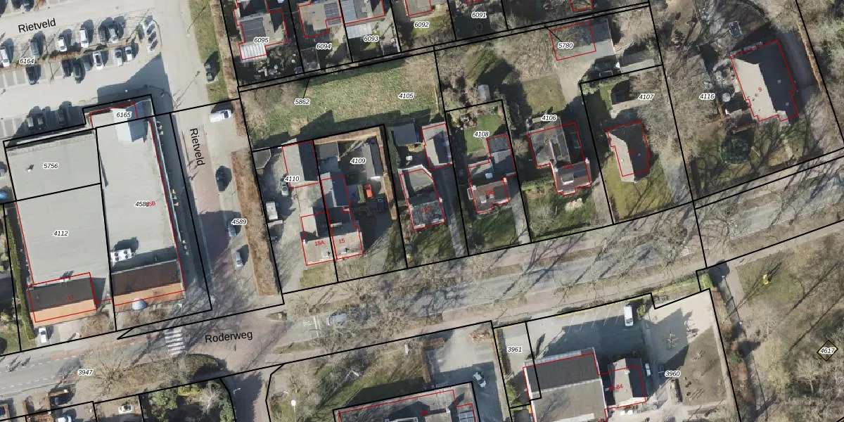 Roderweg 13-C is gelegen op kadastraal perceel RDN01K4105. Deze kadastrale aanduiding is uniek en wordt gebruikt door het Kadaster om eigendomsrechten en andere zakelijke rechten vast te leggen. Het perceel maakt onderdeel uit van de kadastrale gemeente Roden.
