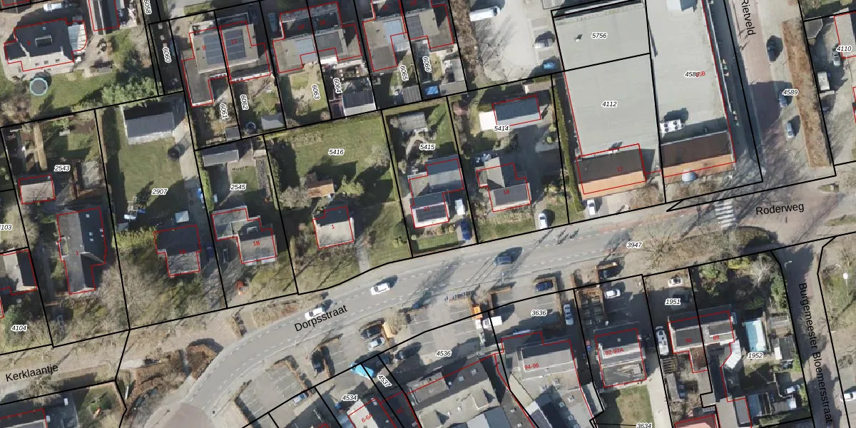 Roderweg 21 is gelegen op kadastraal perceel RDN01K5415. Deze kadastrale aanduiding is uniek en wordt gebruikt door het Kadaster om eigendomsrechten en andere zakelijke rechten vast te leggen. Het perceel maakt onderdeel uit van de kadastrale gemeente Roden.