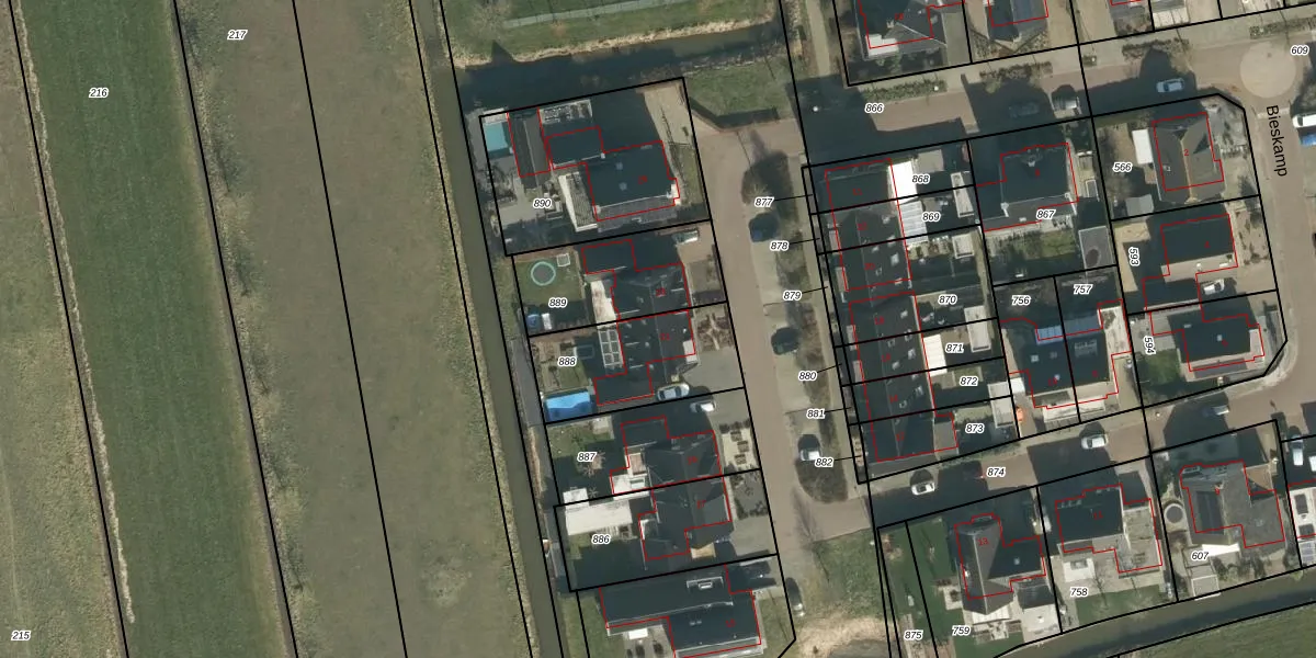Het perceel waarop Bieskamp 21 staat heeft een oppervlakte van 414 m². Dit is een groot perceel. De perceeloppervlakte wordt geregistreerd door het Kadaster. Gedetailleerde informatie over de maten van dit perceel kunt u vinden in het rapport Kadastrale kaart met maatvoering van Bieskamp 21.
