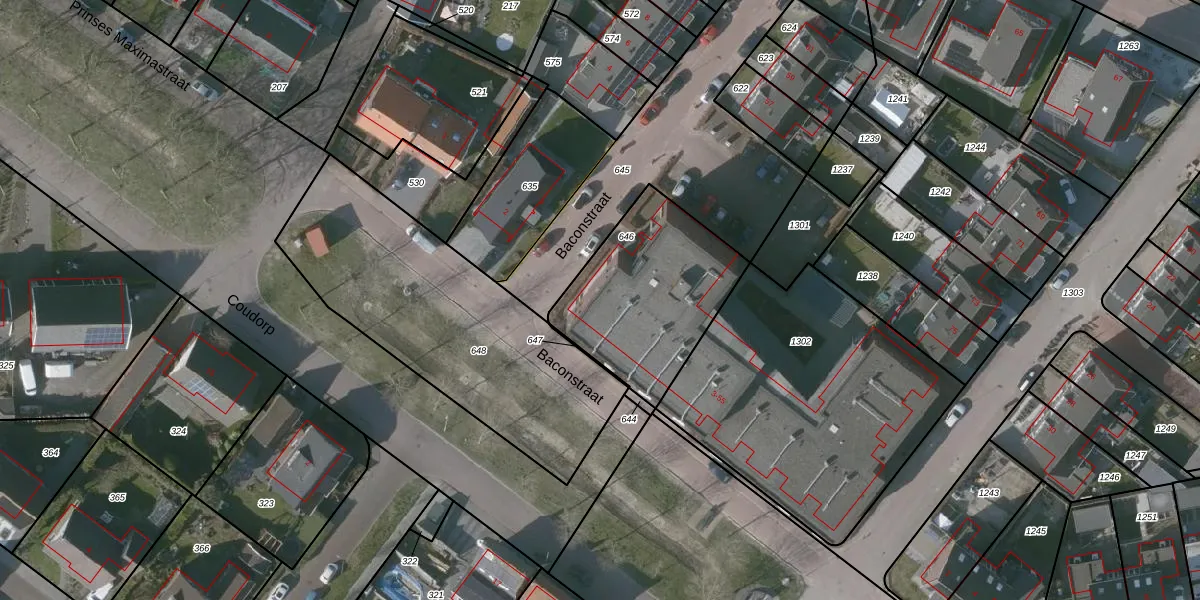 Het perceel waarop Baconstraat 49 staat heeft een oppervlakte van 648 m². Dit is een groot perceel. De perceeloppervlakte wordt geregistreerd door het Kadaster. Gedetailleerde informatie over de maten van dit perceel kunt u vinden in het rapport Kadastrale kaart met maatvoering van Baconstraat 49.