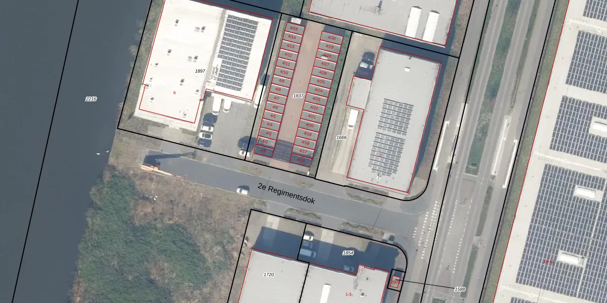 Het perceel waarop 2e Regimentsdok 4-17 staat heeft een oppervlakte van 1200 m². Dit is een zeer groot perceel. De perceeloppervlakte wordt geregistreerd door het Kadaster. Gedetailleerde informatie over de maten van dit perceel kunt u vinden in het rapport Kadastrale kaart met maatvoering van 2e Regimentsdok 4-17.