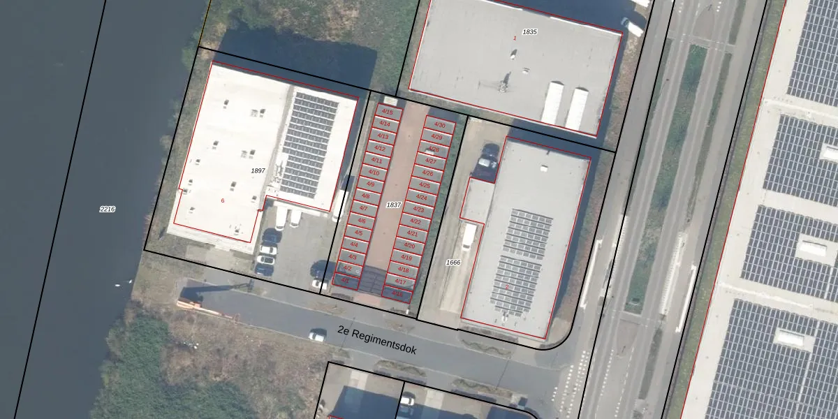Het perceel waarop 2e Regimentsdok 4-23 staat heeft een oppervlakte van 1200 m². Dit is een zeer groot perceel. De perceeloppervlakte wordt geregistreerd door het Kadaster. Gedetailleerde informatie over de maten van dit perceel kunt u vinden in het rapport Kadastrale kaart met maatvoering van 2e Regimentsdok 4-23.