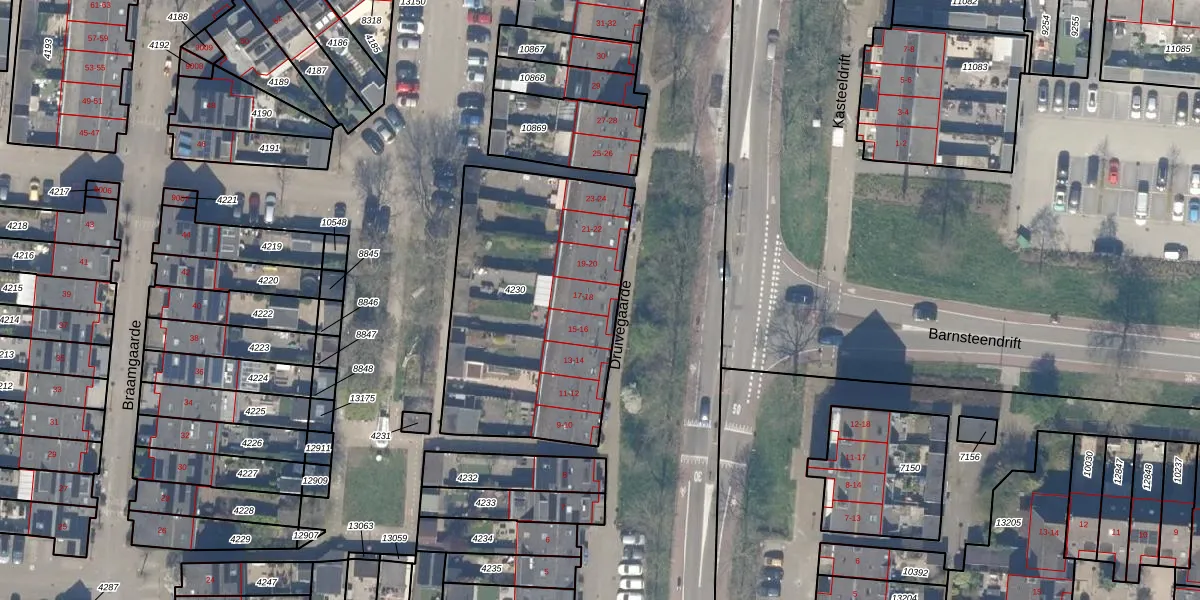 Het perceel waarop Druivegaarde 17 staat heeft een oppervlakte van 1215 m². Dit is een zeer groot perceel. De perceeloppervlakte wordt geregistreerd door het Kadaster. Gedetailleerde informatie over de maten van dit perceel kunt u vinden in het rapport Kadastrale kaart met maatvoering van Druivegaarde 17.