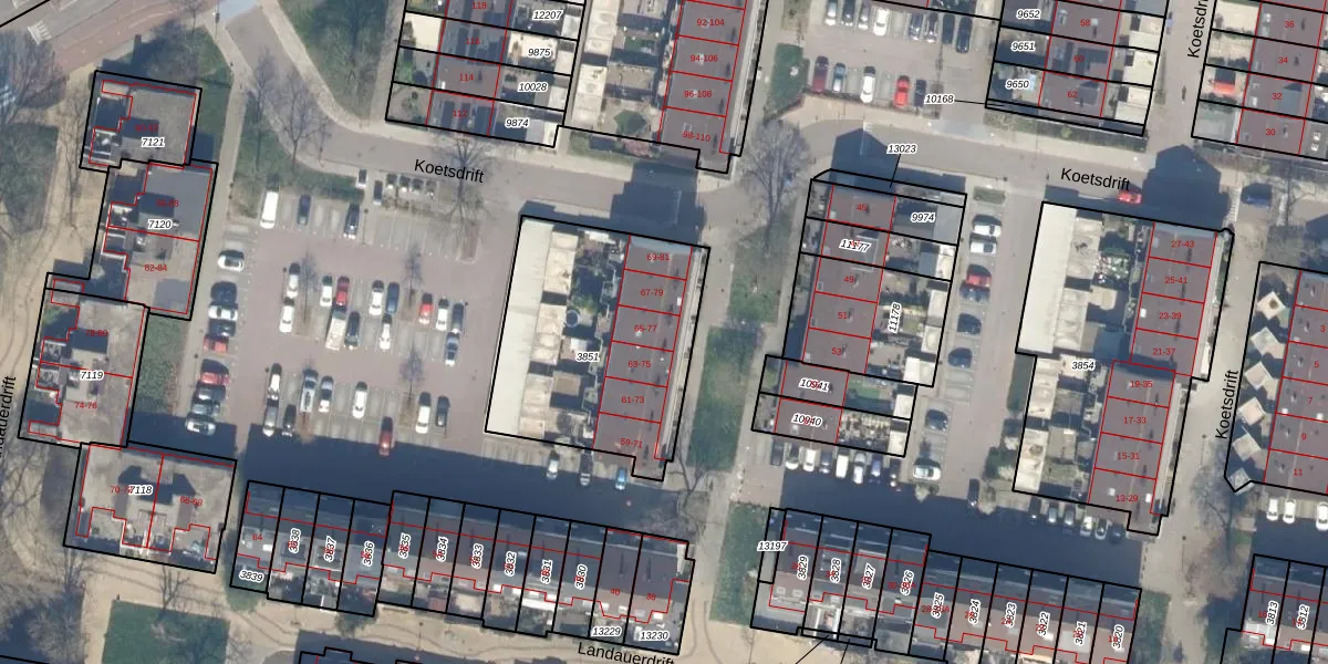 Het perceel waarop Koetsdrift 65 staat heeft een oppervlakte van 958 m². Dit is een groot perceel. De perceeloppervlakte wordt geregistreerd door het Kadaster. Gedetailleerde informatie over de maten van dit perceel kunt u vinden in het rapport Kadastrale kaart met maatvoering van Koetsdrift 65.